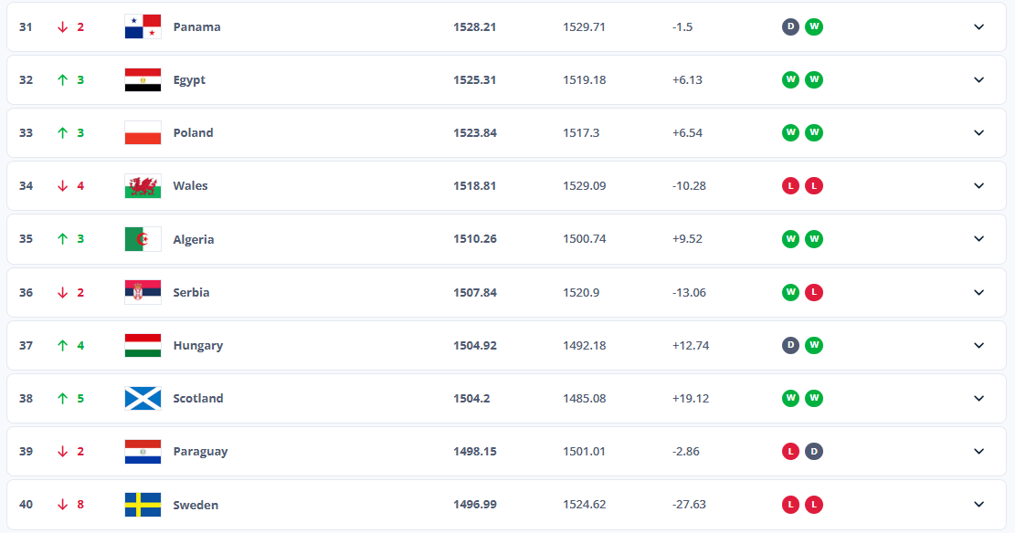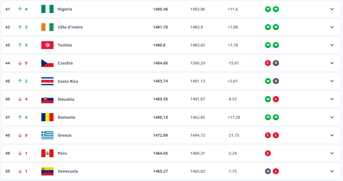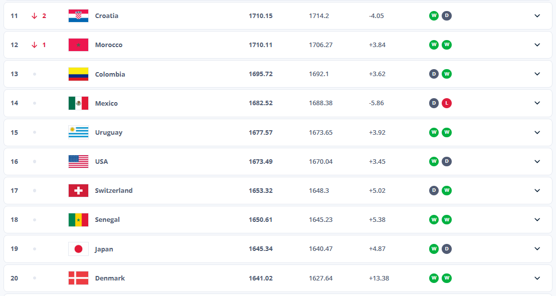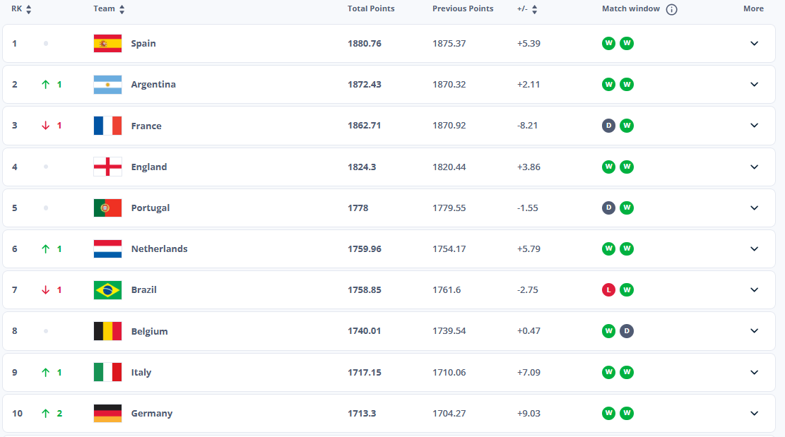 代表ウィークで、パラグアイ代表との2-2の引き分けやブラジル代表との3-2の逆転勝利などがあり、実績としては悪くないものの、他チームの動きもあり、順位の変動はなかったようです。
